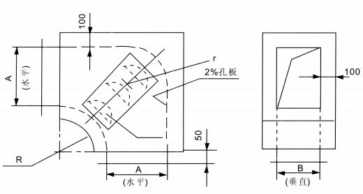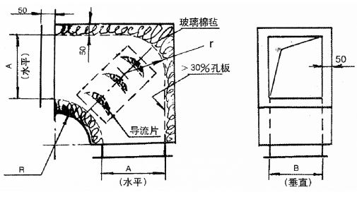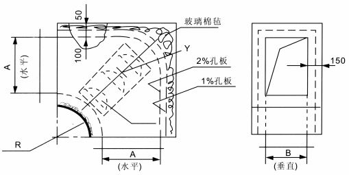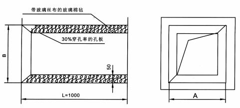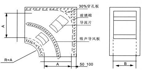 - ZWB型消聲彎管是使風管短邊B拐彎90度,并具有一定消聲作用的彎管,其拐彎半徑為風管內壁長邊A,吸聲材料厚為50和100mm。