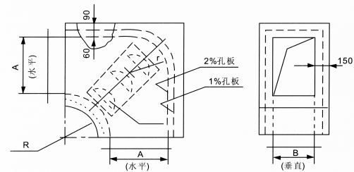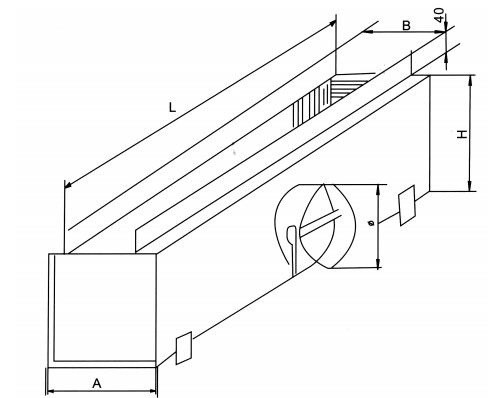 - B尺寸為接條縫風口喉徑寬度A≥B+100,L為風口長度 H≥Φ+100。